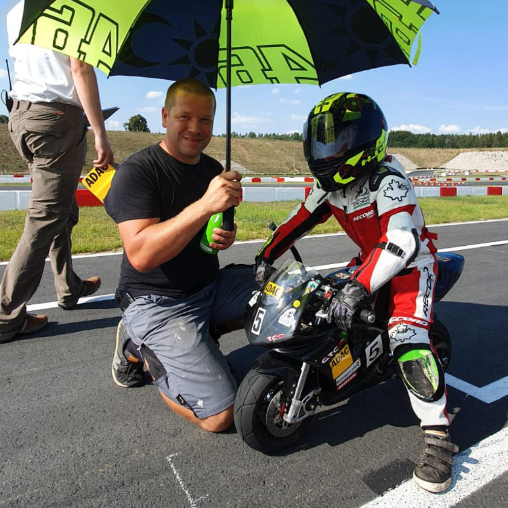 Ich bin am 23.08.2012 in Saalfeld geboren. Schon als Baby war ich bei Motorradrennen im In- und Ausland und anderen tempobehafteten Aktivitäten dabei. Meine Neugier kennt keine Grenzen und so habe ich viele fahrbare Untersätze ausprobiert. Gemäß dem Motto: ,,Je schneller desto besser!" und ,,Geht nicht, gibt`s nicht!" Angefangen bei Bobbycar und Laufrad, wechselte ich mit 3 Jahren auf ein Kinderquad mit Benzinmotor. Zu meinem 4. Geburtstag bekam ich eine Yamaha PW 50 auf der ich anfangs noch mit Stützrädern unterwegs war. Die wurden aber schnell überflüssig und ich sauste damit über Feldwege, Wiesen, die Urlaubsstrände und durch den Schnee. Im September 2018 gings dann zum Pocketbike Schnupperkurs des AMC - Sachsenring. Das begeisterte mich vollkommen, von da an ging es zum regelmäßigen Training nach Sachsen. Hier konnte ich mich so steigern, dass ich mir im Frühjahr 2019 mein eigenes Pocketbike verdiente und es folgten die ersten Rennteilnahmen als Gaststarter beim ADAC Pocketbike Cup und beim Sachsencup. Das Adrenalin hatte mich vollkommen im Griff. Ich hatte "Rennblut" geleckt!