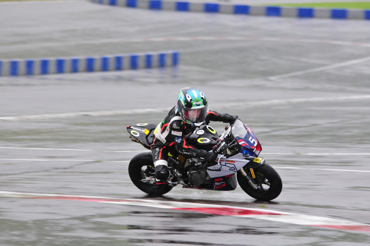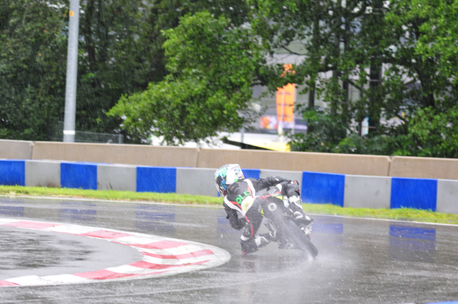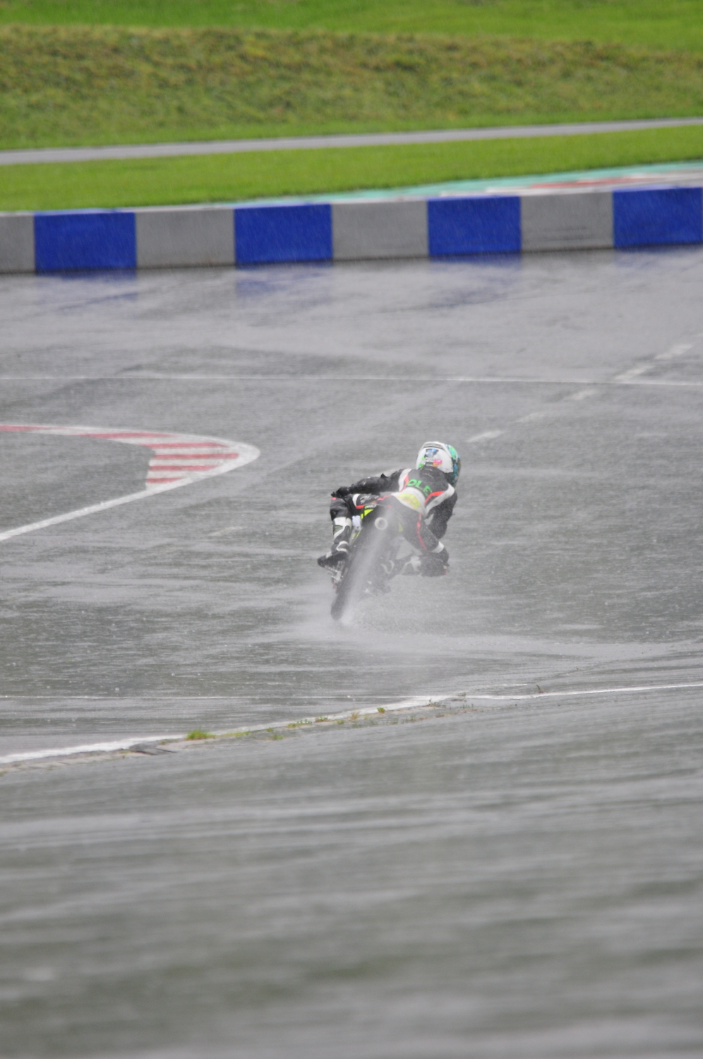 Das Wochenende startete mit Dauerregen – mein persönlicher Albtraum, aber nicht zu ändern. Am Trainingsfreitag kämpfte ich mich Schritt für Schritt voran und hatte immer mehr Vertrauen in mein Motorrad. Die Rundenzeiten wurden immer besser und ich kam fast sturzfrei durch.